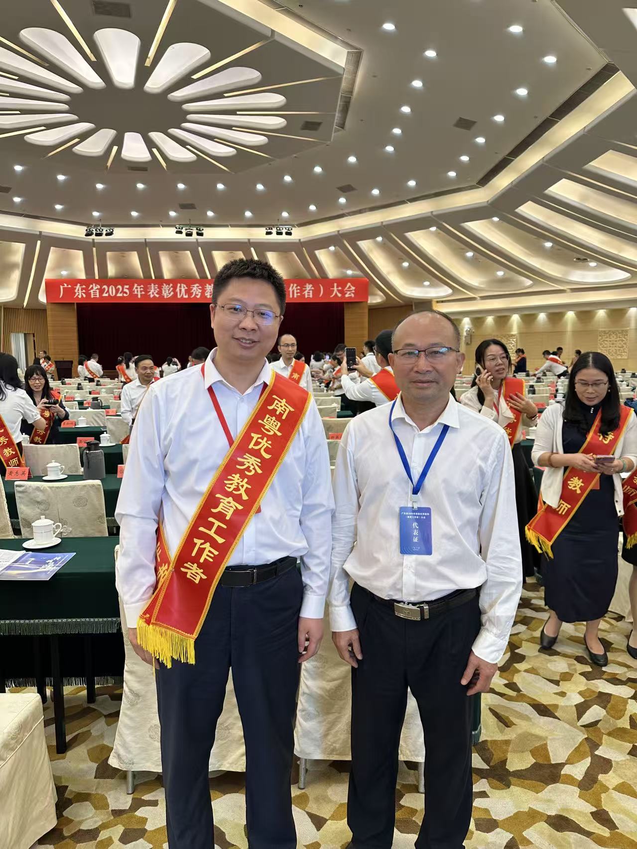 9月11日,广东省2025年表彰优秀教师(教育工作者)大会在广州举行。共有499名特级教师、1675名南粤优秀教师、170名南粤优秀教育工作者获得表彰。学校智能制造与电气工程学院副教授陈玉莲、外国语学院副教授申丹荣获“南粤优秀教师”称号,人工智能学院王煜林教授荣获“南粤优秀教育工作者”称号,并作为学校教师代表参加了表彰大会。我校党委书记黄圣诚受邀参加此次表彰大会。