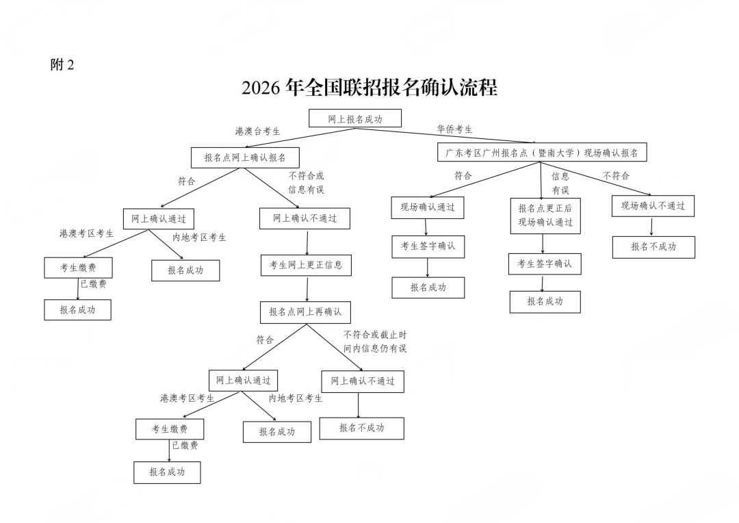 港澳台考生实行网上报名确认,3月11日起由相应考区报名确认负责机构负责;华侨考生实行现场报名确认,由广东考区广州报名点(暨南大学)负责。具体进度由各考区(报名点)负责机构安排。
