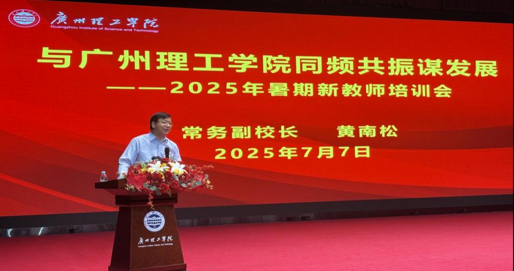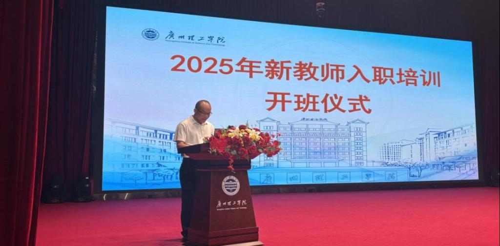 7月7日上午,在工程楼3号报告厅举行了开班仪式,开班仪式由教师教学发展中心的程振锋主任主持。在仪式上,黄圣诚书记代表学校党政领导、全校师生欢迎新教师加入广州理工学院。黄书记介绍了学校在党建引领、人才培养、产教融合、科研创新等领域取得的突破性成果。并立足学校未来发展蓝图,明确指出“以评促建强内涵、以硕点建设促跨越”当前学校重点工作领域。结合新一轮科技革命对人才培养的新要求,黄书记向新教师提出四点期望:第一,用党的创新理论铸魂育人,涵养师德师风;第二,要加强自主学习,提升专业素养;第三,要尽快融入教学团队,担当育人使命;第四,要有强烈的归属感,做爱校荣校兴校表率。