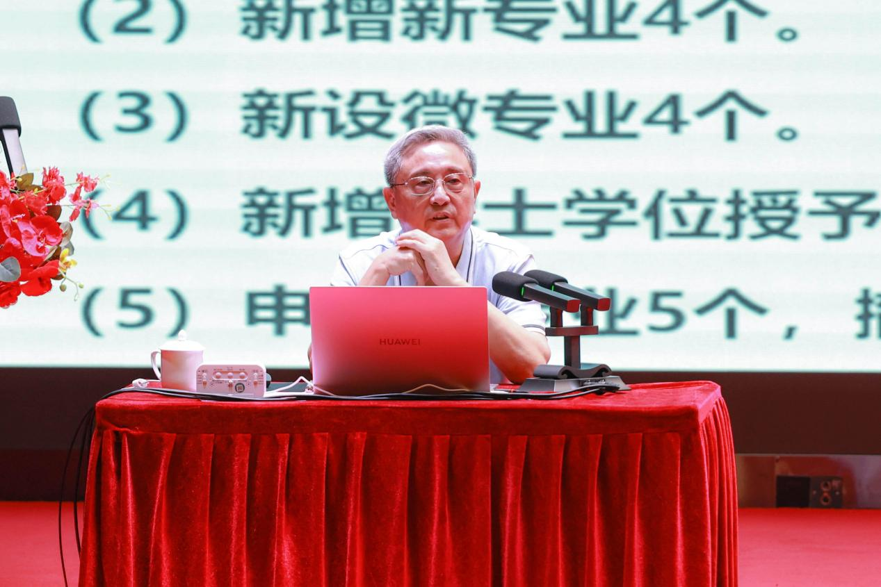 胡社军校长在会上对本学期工作进行了全面回顾与总结,并对下学期及暑期工作进行了详细部署。胡校长指出,本学期学校在教育教学、科研创新、师资队伍建设等方面取得了显著成效,特别是在合格评估准备、学科专业建设及校企合作方面取得了突破性进展。面对高等教育的新机遇,学校将扎实推进本科教学工作合格评估和硕士学位授予立项建设单位相关工作。同时,积极响应教育强国战略,精准优化专业设置,持续深化教育教学改革,全面提升学校整体办学水平。胡校长强调,全校教职工要积极行动起来,以高度的责任感和使命感,共同推动学校高质量发展,为出色完成各项任务而努力奋斗。