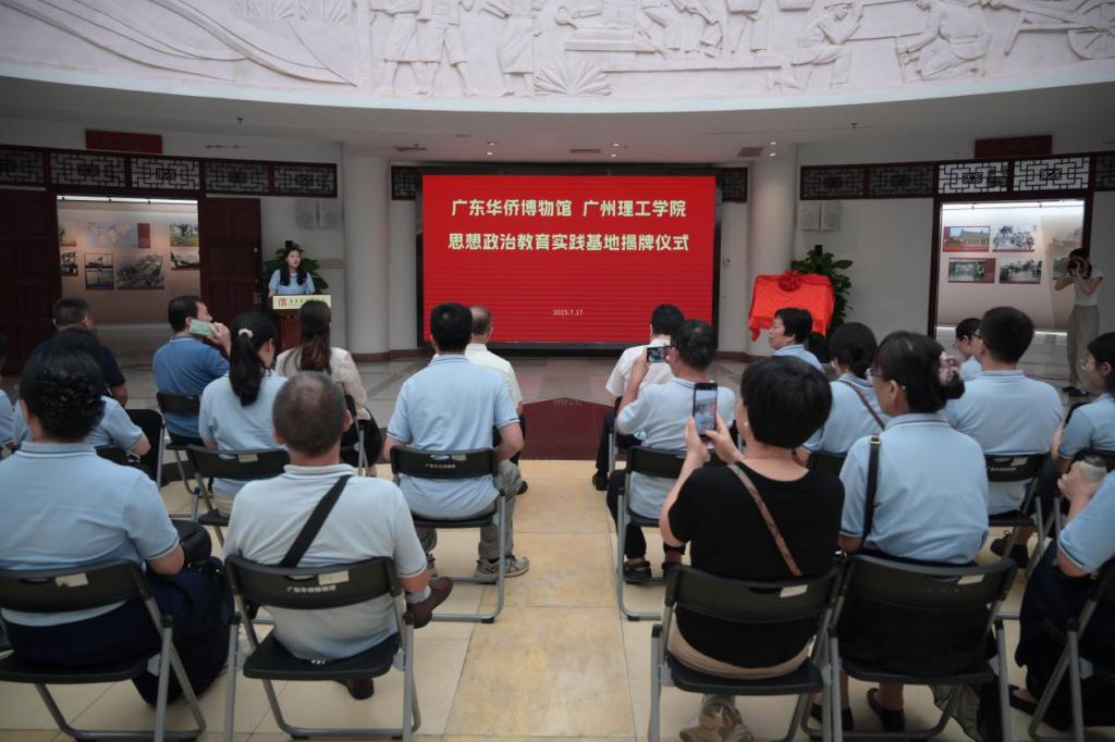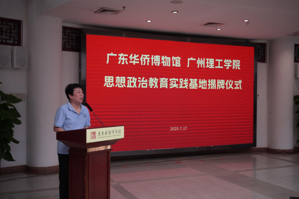 7月17日上午,广州理工学院与广东华侨博物馆共建“思想政治教育实践基地”揭牌仪式在广东华侨博物馆举行。广东华侨博物馆馆长钟纲、副馆长彭静玲、职工代表,广州理工学院党委书记黄圣诚、党委职能部门负责人、二级学院党总支书记代表、马克思主义学院教师代表参加活动。活动由马克思主义学院党总支副书记郭芸主持。