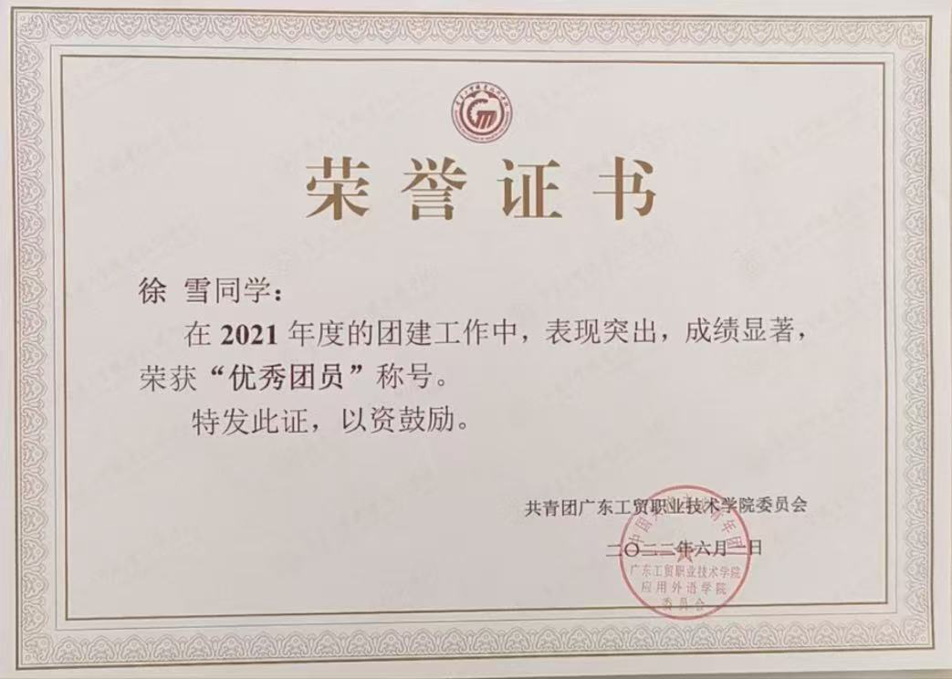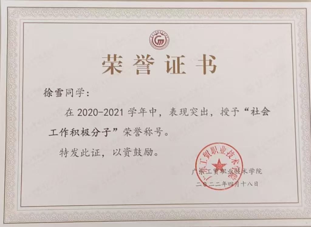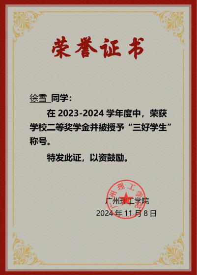 大学期间,她勤奋、进取、阳光,不仅在学业上刻苦钻研,更积极投身于各类实践活动,不断锤炼自我、提升综合能力。荣获2025届“优秀毕业生”称号、2023-2024学年学校二等奖学金及“三好学生”称号、第十四届“挑战杯”广东大学生创业计划竞赛金奖、“建行杯”中国国际大学生创新大赛(2024)广东省分赛银奖、2021年度“优秀团员”、2020-2021学年“社会工作积极分子”“学在广理”征文活动优秀奖等多项荣誉。