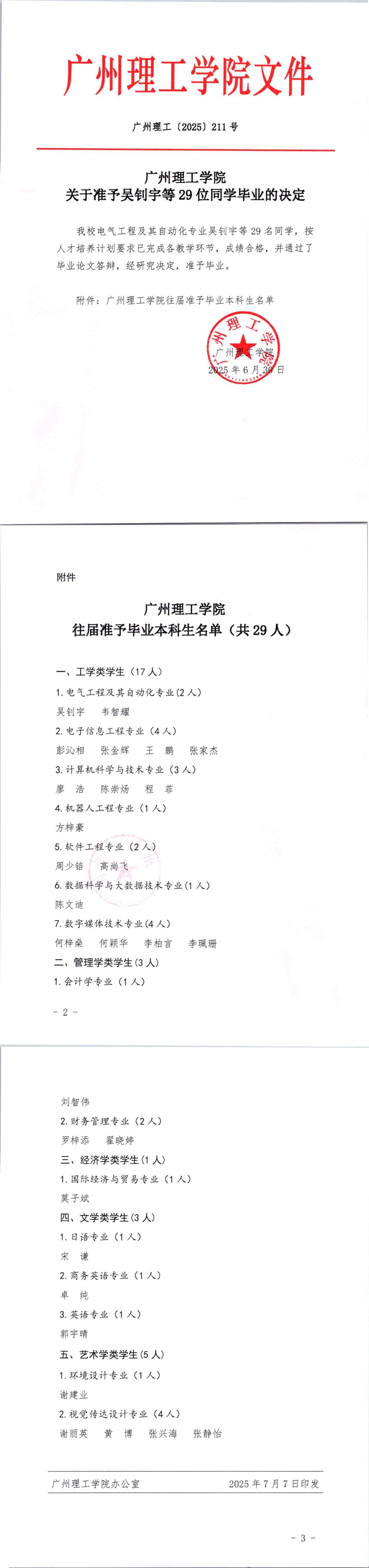 关于准予吴钊宇等29位同学毕业的决定(广州理工〔2025〕211号)