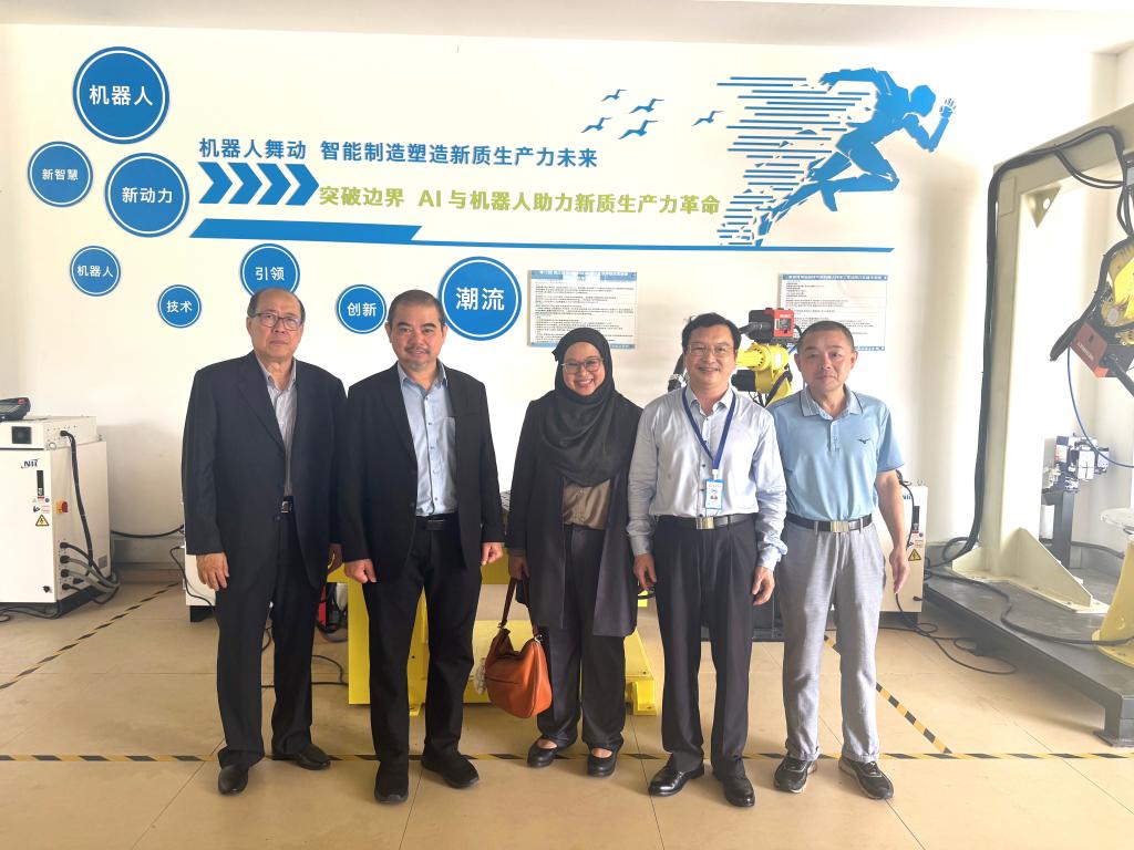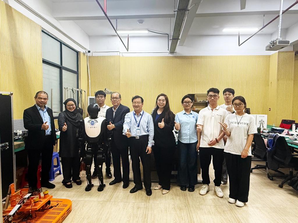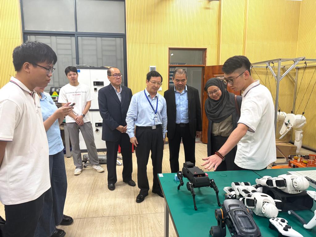 会谈前,梁学宏院长带领沙捞越大学副校长一行参观了智能制造开放实验室、新能源汽车实验室和机器人中心,全面展示了我校人工智能机器人等产品的研发以及所取得的最新成果。智能制造开放实验室负责人周家勇、智能制造与人工智能研究院副院长万频分别向马来西亚客人详细介绍了我校自主研发项目和应用场景,并认真解答他们提出的问题。